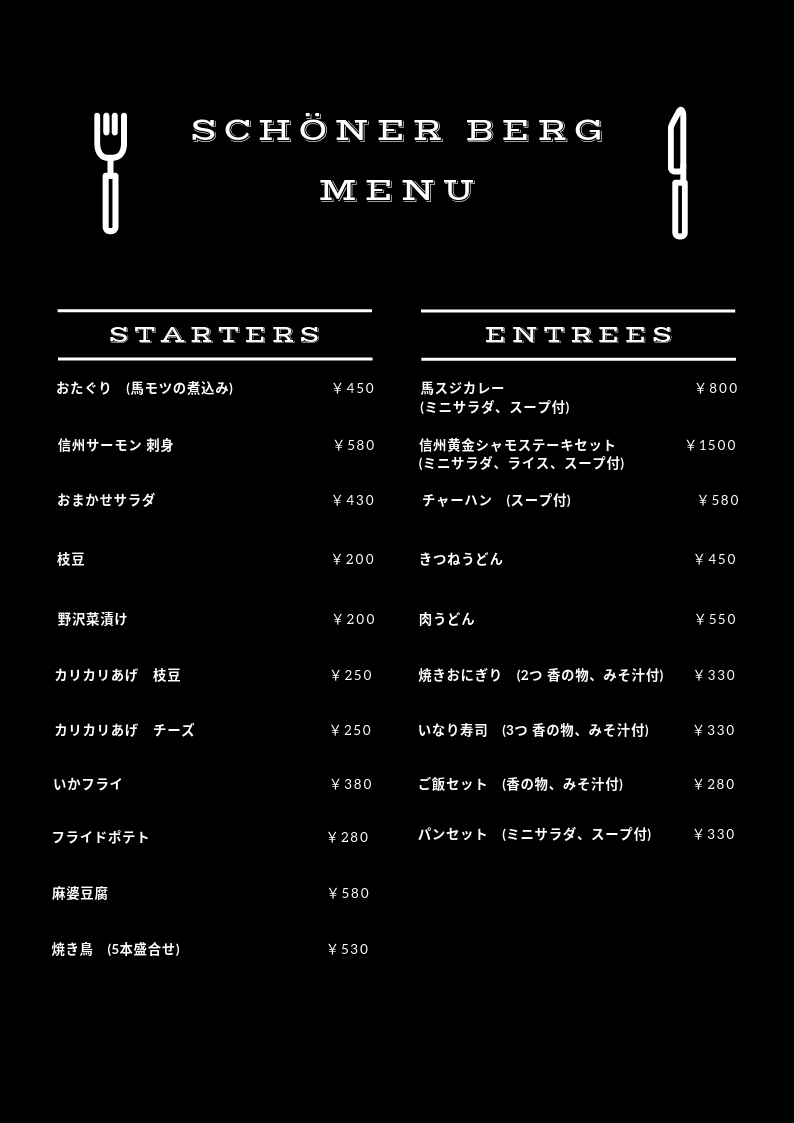 ご宿泊プランのご夕食以外にも 長野のご当地メニューからおつまみまで、低価格でご用意しております。