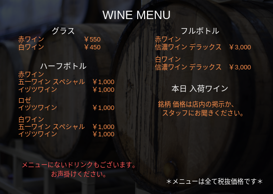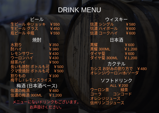 メニュー表以外にも長野の銘酒、ワイン、地ビール等 低価格で取り揃えております。
